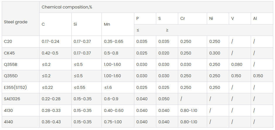 मटेरियाएल: प्र355बी, क्यू355डी, ई355,एसटी52, सी20,सी.के45, एसएई1026, 4130, 4140, 34सीआरएमओ4, 35सीआरएमओ, 42सीआरएमओ